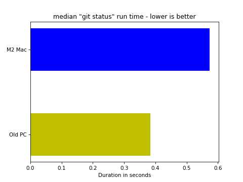 For `git status`, the Mac had a median execution time of 0.57s while the PC was 1.5x faster and had a median execution time of just 0.38s.