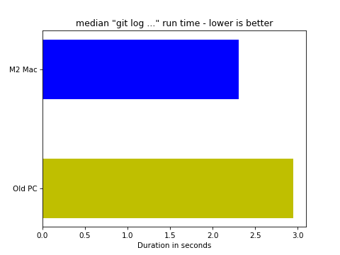 For `git log`, the Mac had a median execution time of about 2.3s but this time the PC's median execution was 1.3x slower at 2.95s.
