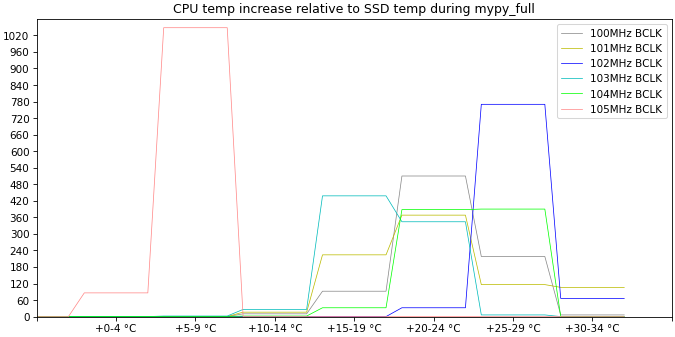 I am also curious about the "Configuration 3" from my previous BCLK overclock attempt which had a 100MHz BCLK but CPU and memory increased by 10% - this configuration showed a 4% improvement on the mypy benchmark which can't be accounted for by the memory speed increase and seems to indicate that increasing the CPU base frequency from 3.4GHz to 3.7GHz provides some benefit even to a single-threaded benchmark.