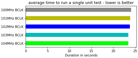 In this benchmark we can see that the 105MHz BCLK configuration is noticeably slower (more than 30% slower than stock). I have removed the 105MHz configuration from subsequent charts since it is the same story for 105MHz on all benchmarks.